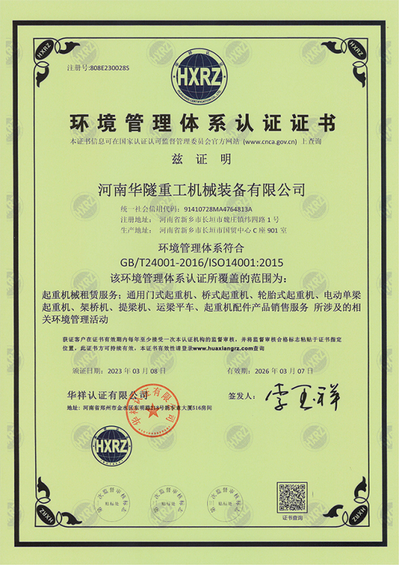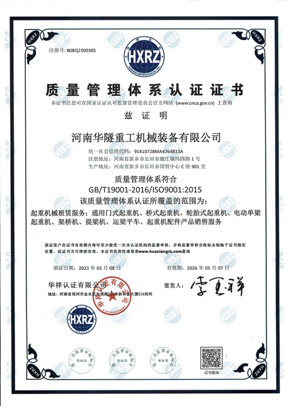 河南華隧重工機械裝備有限公司主要從事通用門式起重機、橋式起重機、電動單梁起重機,輪胎式起重機、架橋機、提梁機、遠梁平車、鋼絲繩電動萌蘆、卷揚機、起重配件制造、銷售:起重機械租賃、安裝和維修,起重設(shè)備園收,機械設(shè)備維修,鋼結(jié)構(gòu)工程承包,橋梁工程及技術(shù)咨淘服務(wù),銷售五金制品、機電設(shè)備:建設(shè)工程監(jiān)理,建設(shè)工程設(shè)計,各類工程建設(shè)活動,建筑勞務(wù)分包,建筑物折除作業(yè),施工作業(yè),工程管理服務(wù),土石方工程施工,裝如發(fā)運。  公司已通過IS0國際質(zhì)量、環(huán)境、健康與安全三合一標準認證,特種設(shè)備制造許可證和特種設(shè)備安裝改造維修許可證。擁有完熟的質(zhì)量管理體系。嚴格的管理制度,強大的生產(chǎn)能力和先進的檢測手段,在保證產(chǎn)品質(zhì)量的同時,也具備了極強的市場競爭力。  公司堅持科技創(chuàng)新為理念,產(chǎn)品質(zhì)量為核心,注重信譽,建立了減信可靠、快捷、思速。便利周到的售后服務(wù)網(wǎng)絡(luò)。  我們擁有的技術(shù)專家和技術(shù)服務(wù)隊伍為客戶提供充善的售前技術(shù)支持和全天候的售后服務(wù)體系,讓您無后顧之憂,享受一站式的超值服務(wù)。  “華隧重工,伴您成功“是華隧重工永遠的宗指,真被的希望與各界朋友攜手并進。共創(chuàng)輝準!